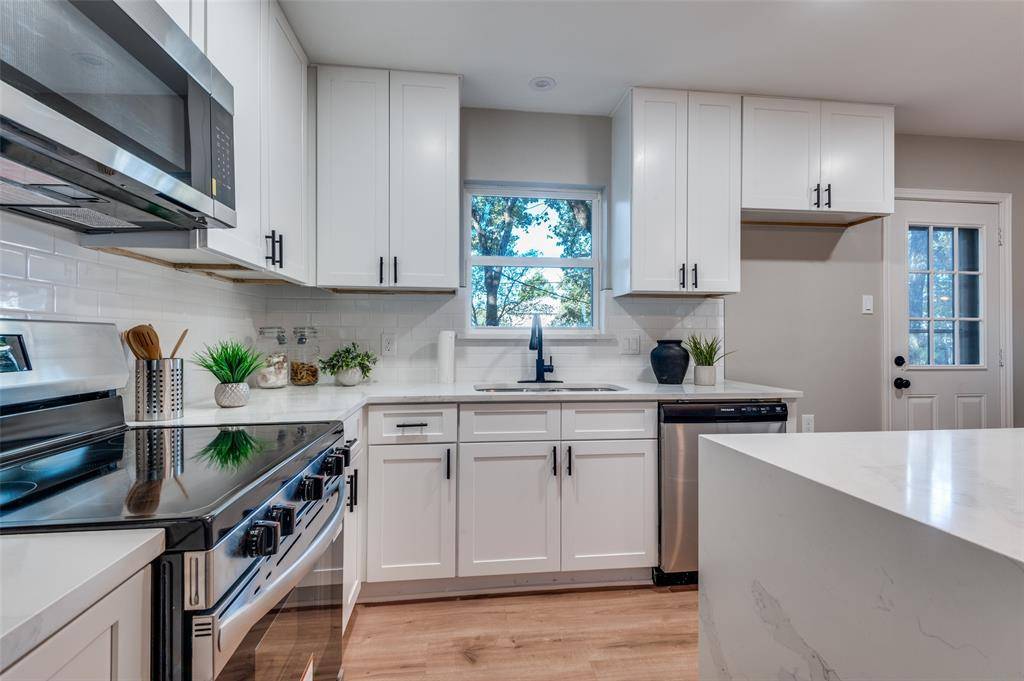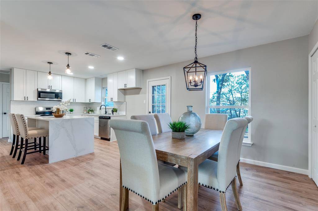 Step into timeless charm with this beautifully renovated 3-bedroom, 2-bath home in the heart of Irving. Nestled under a canopy of mature trees, this home delivers style and serenity with designer touches throughout. Enjoy a bright, open-concept layout featuring a cozy living space, elegant dining area, and a fully remodeled kitchen with white shaker cabinets, quartz countertops, stainless steel appliances, and a waterfall island perfect for casual dining.