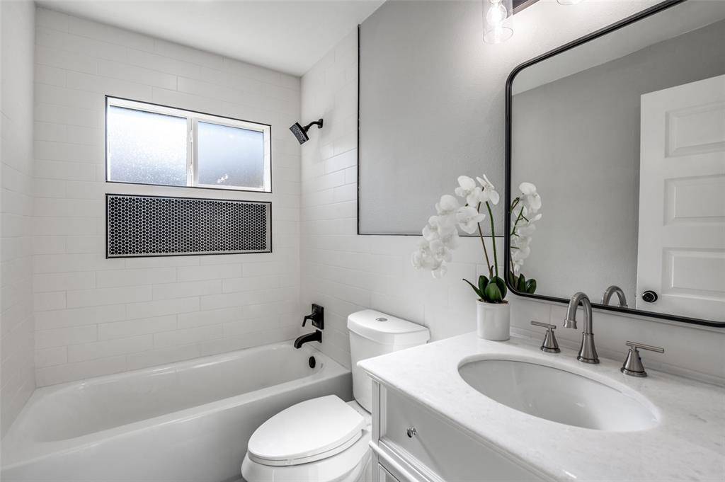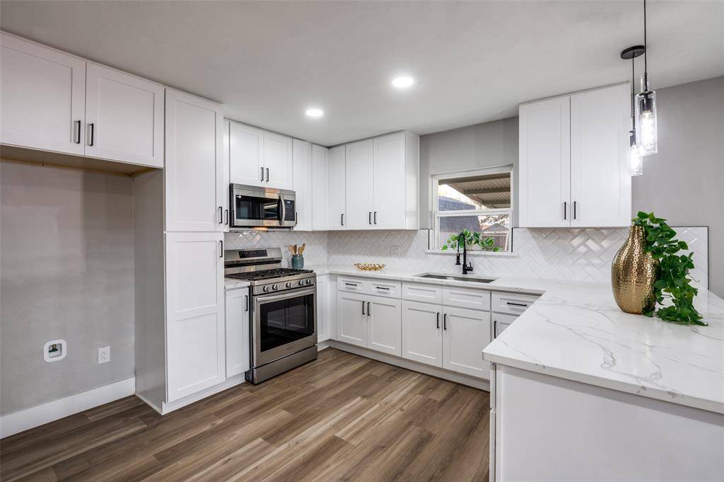 This beautifully updated 4-bedroom, 2-bathroom home blends modern style with everyday comfort. Inside, you'll find an open-concept layout with luxury vinyl plank flooring, recessed lighting, and a sleek neutral palette throughout. The kitchen is a true showstopper—featuring quartz countertops, brand-new shaker cabinets, stainless steel appliances, a gas range, and stylish pendant lighting over the peninsula. The primary suite offers generous natural light and a fully updated en-suite bath with designer finishes. Secondary bedrooms are spacious and share a hallway bathroom with custom tile and matte black fixtures. Enjoy outdoor living with a private backyard, large covered patio, and storage shed—ideal for relaxing, entertaining, or creating your dream garden. Additional upgrades include a new roof, updated electrical, fresh paint inside and out, and an extended driveway for extra parking.