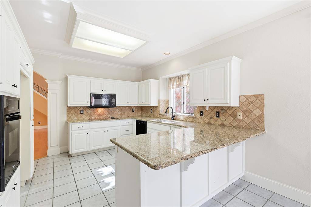 Elegant great size kitchen with granite countertops and ceramic flooring. Breakfast area views patio deck and nature.